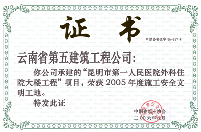 昆明市第一人民醫院外科住院大樓—2005年度“AAA級安全文明標準化誠信工地”